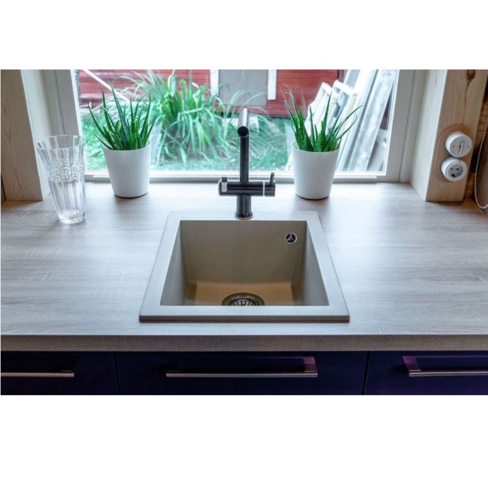 Мойка кухонная Omoikiri из коллекции Bosen 41-BE имеет размеры 410х500 мм., изготовлена из искусственного гранита. Форма — прямоугольная, одна чаша без отверстия для смесителя. Сифон в комплекте. Ширина чаши 34. Подстольный монтаж.