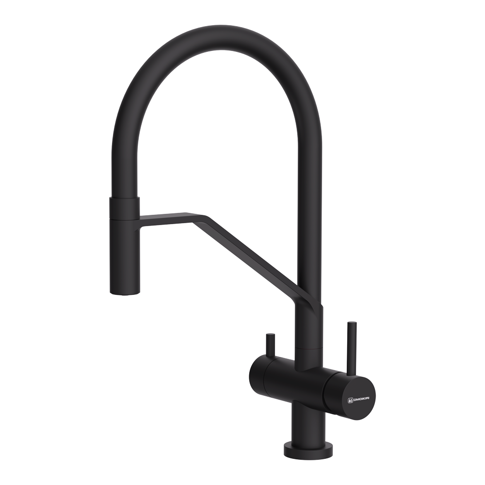 Смеситель для кухни Omoikiri Akeno с подключением фильтра оснащен рычажным управлением для регулировки температуры и напора воды. Горизонтальный монтаж на 1 отверстие. Гибкий излив 230 мм.