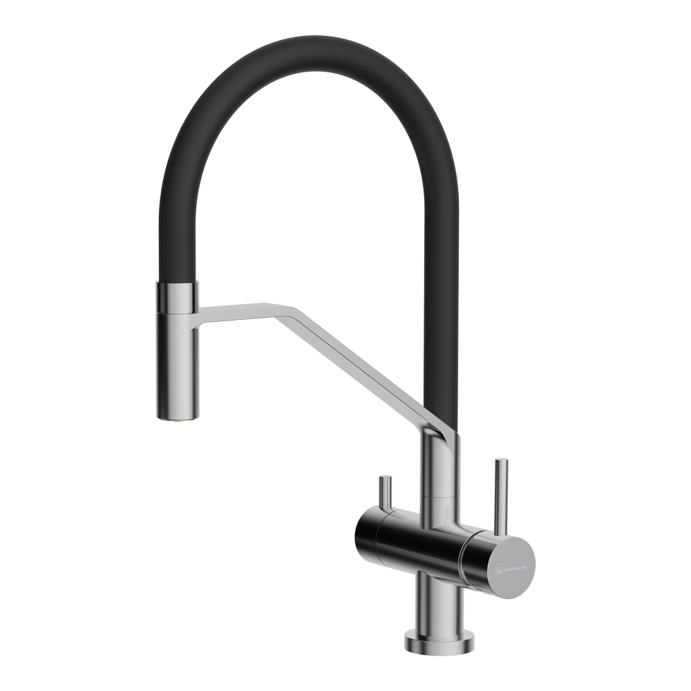 Смеситель для кухни Omoikiri Akeno с подключением фильтра оснащен рычажным управлением для регулировки температуры и напора воды. Горизонтальный монтаж на 1 отверстие. Гибкий излив 230 мм.