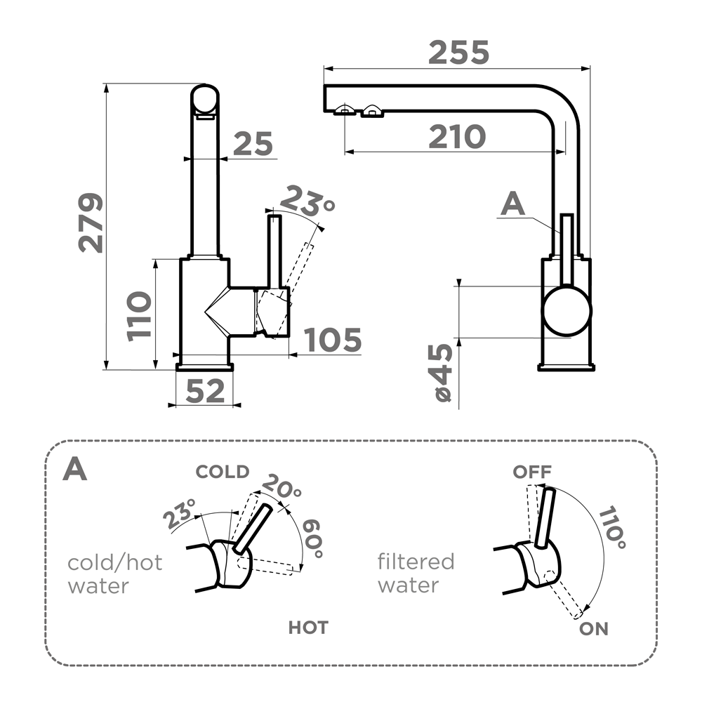 Смеситель для кухни Omoikiri Nakagawa 2 Plus с подключением фильтра оснащен рычажным управлением для регулировки температуры и напора воды. Горизонтальный монтаж на 1 отверстие. Поворотный излив 210 мм.