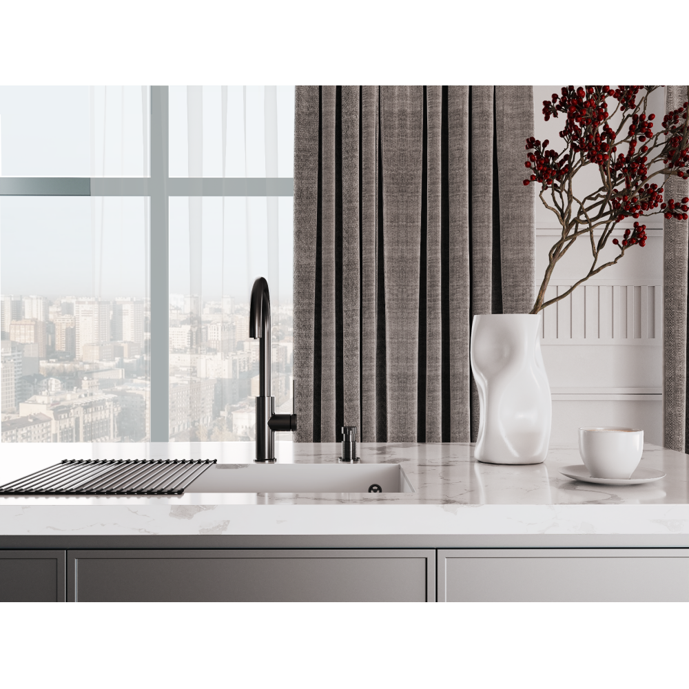 Смеситель для кухни Omoikiri Okawa 2 Plus с подключением фильтра оснащен рычажным управлением для регулировки температуры и напора воды. Горизонтальный монтаж на 1 отверстие. Поворотный излив 215 мм.