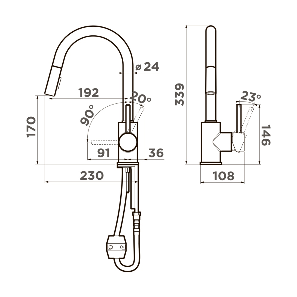Смеситель для кухни Omoikiri Shinagawa оснащен рычажным управлением для регулировки температуры и напора воды. Горизонтальный монтаж на 1 отверстие. Вытяжной излив 192 мм.