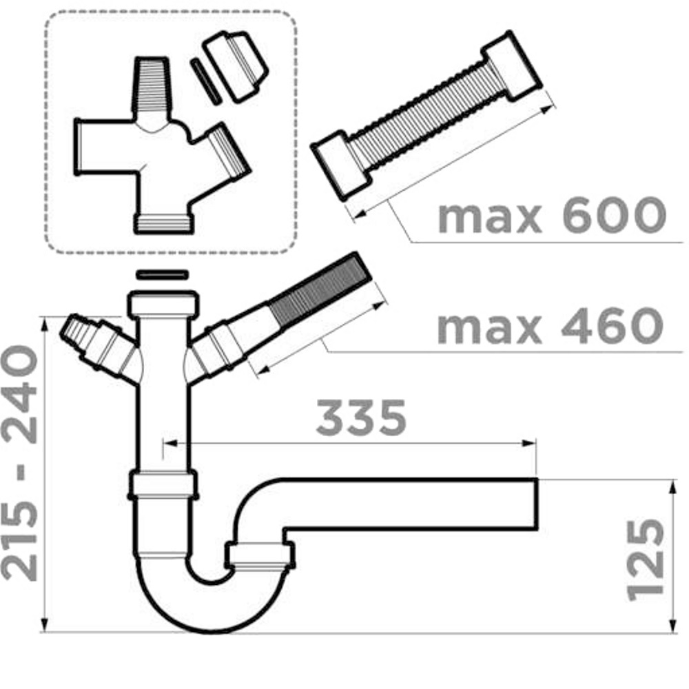 Подходит для одночашевых и двухчашевых моек. Имеет дополнительный выход для стиральной или посудомоечной машины.